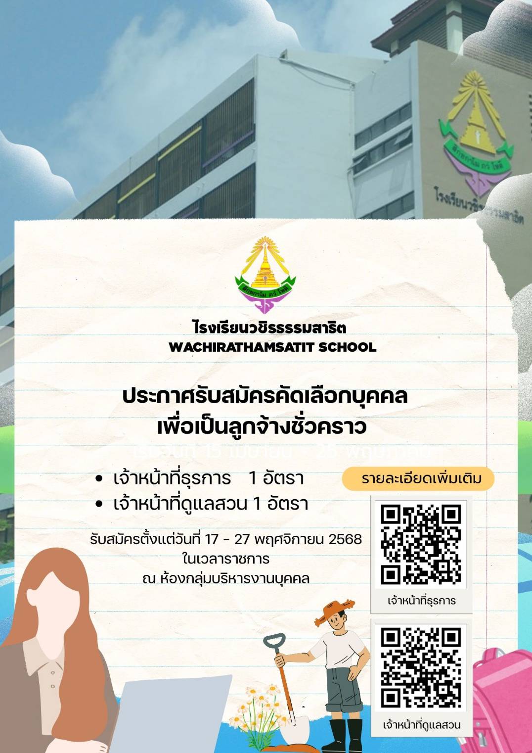 ประกาศโรงเรียนวชิรธรรมสาธิตเรื่อง รับสมัครพนักงานจ้างเหมาบริการ
