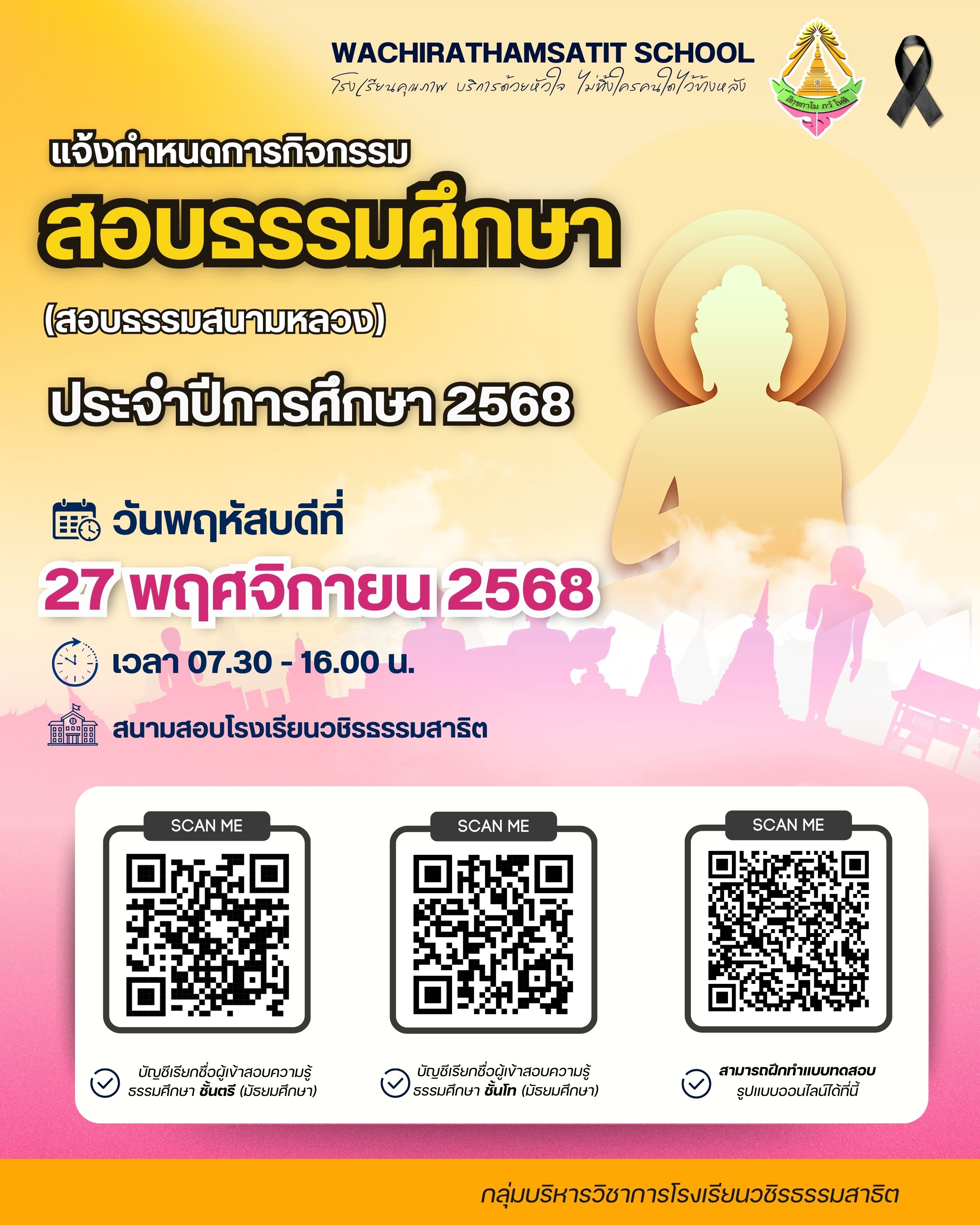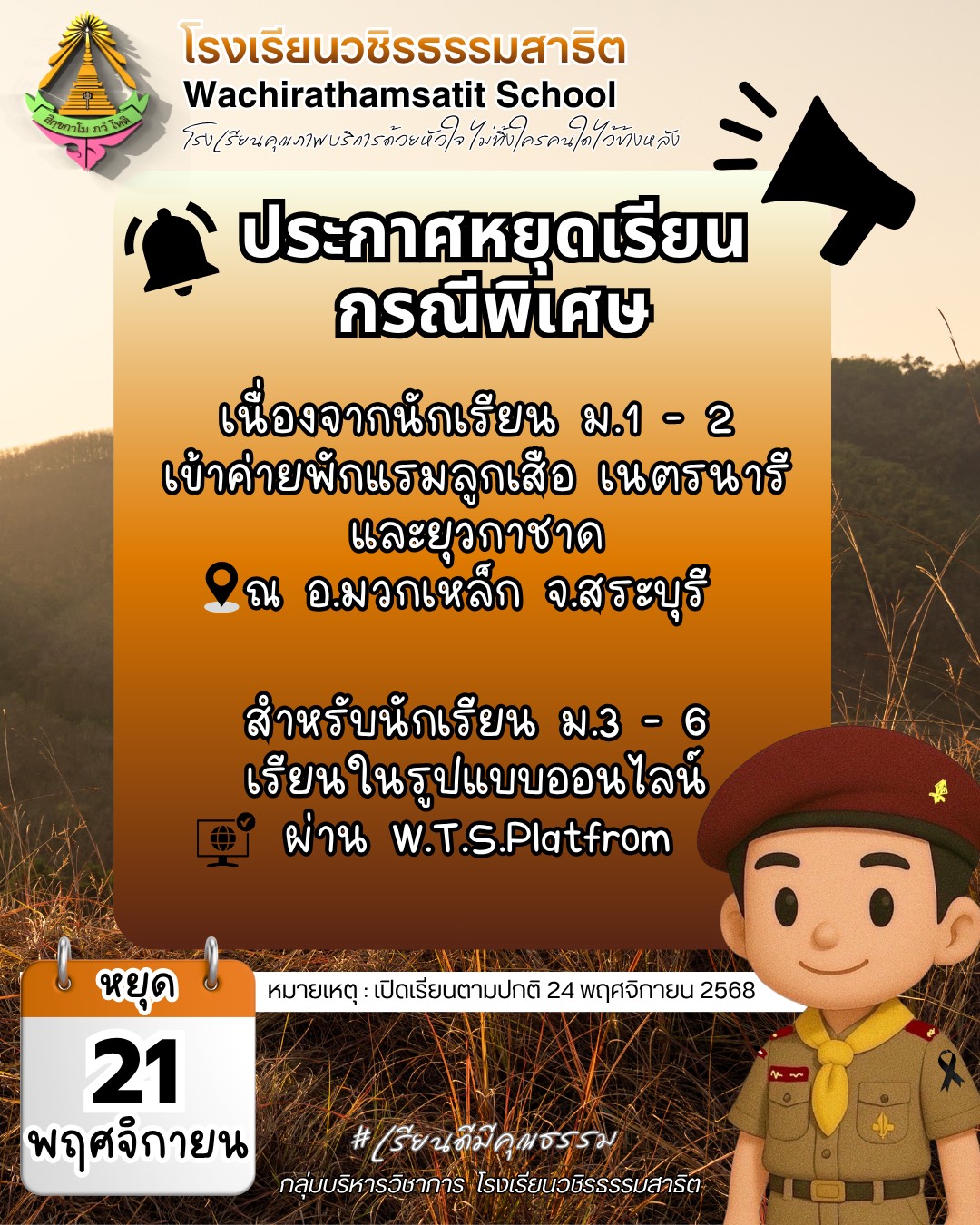 ประกาศโรงเรียนวชิรธรรมสาธิต เรื่อง กำหนดวันปิดภาคเรียนที่ 1 และเปิดภาคเรียนที่ 2 ปีการศึกษา 2568