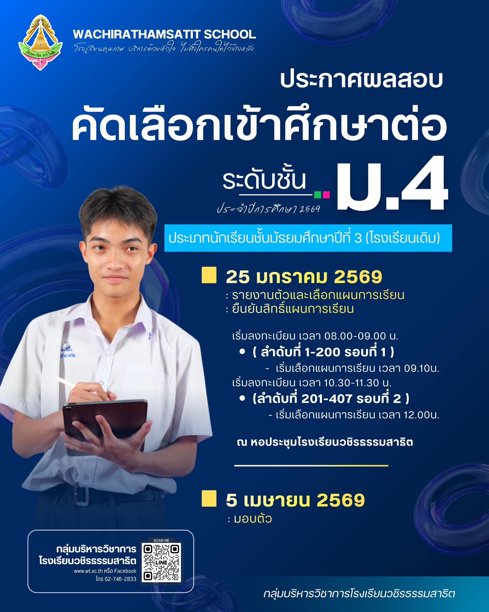 ประกาศผลสอบคัดเลือกเข้าศึกษาต่อ ม.4 ประเภทนักเรียน ม.3 (โรงเรียนเดิม)