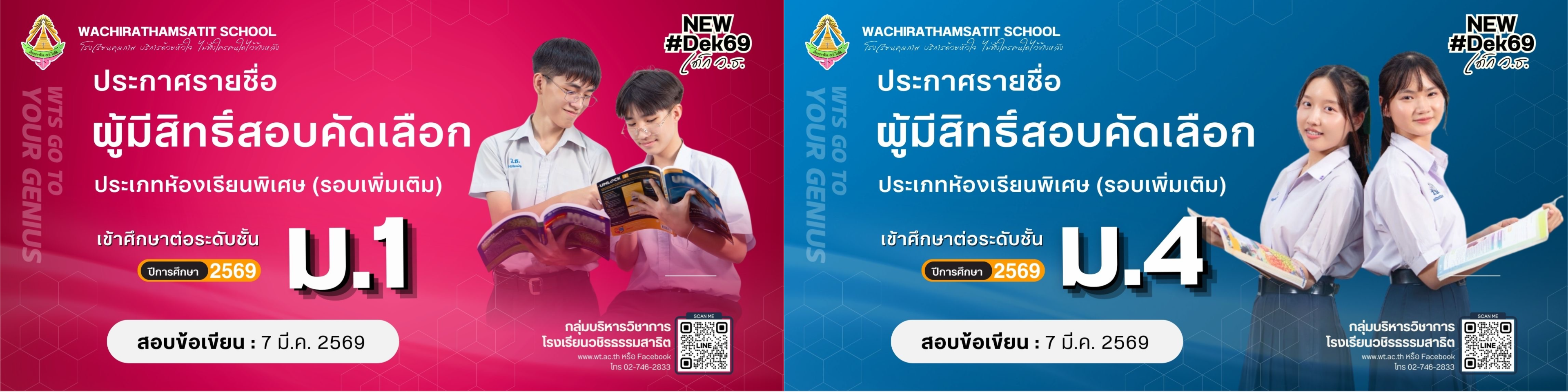 ประกาศ รายชื่อผู้มีสิทธิ์สอบคัดเลือกเข้าศึกษาต่อระดับชั้นมัธยมศึกษาปีที่ 1 และ 4 ปีการศึกษา 2569 ประเภทห้องเรียนพิเศษ (รอบเพิ่มเติม)